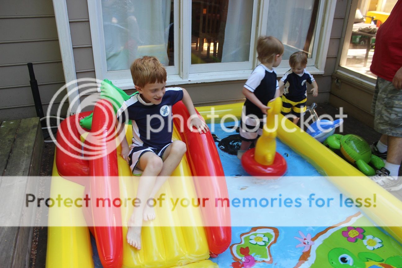 | This cutie was a little skeptical of the cold water, but he loved the pool toys! |