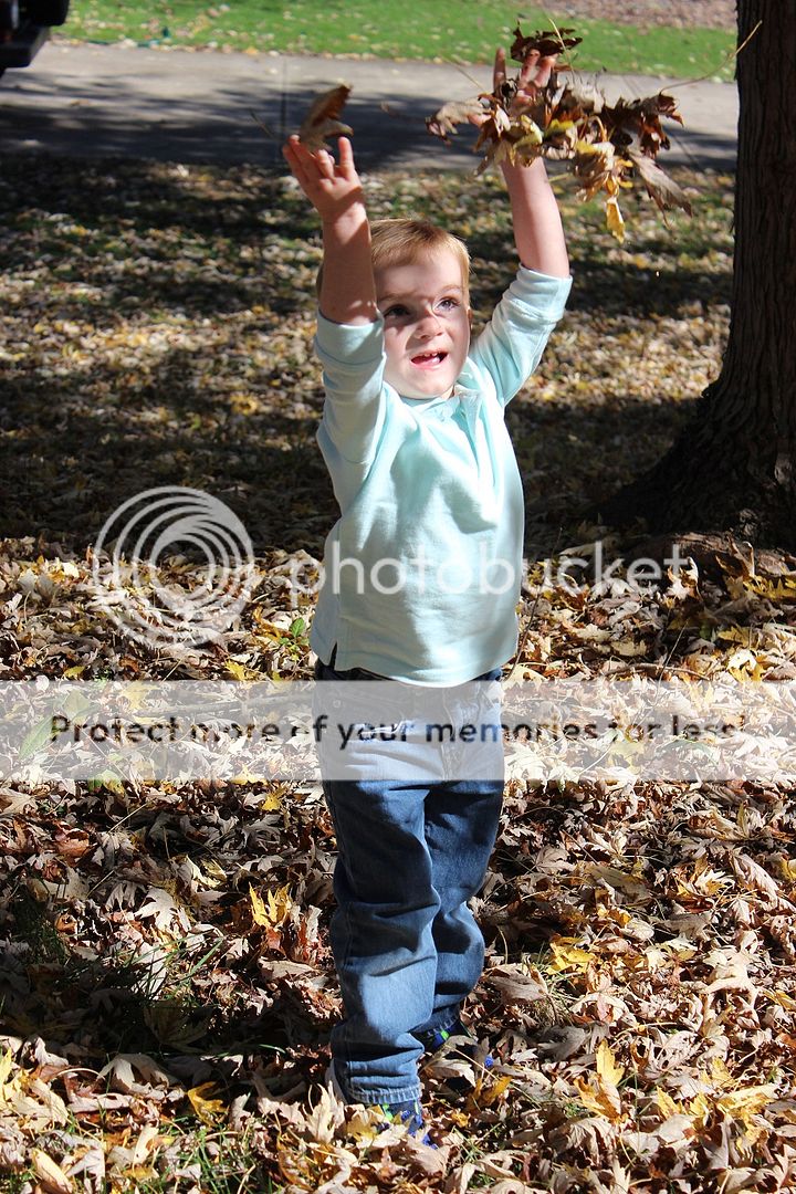 Well, it is no secret that our boys love to jump in piles of leaves. Brody was begging to jump in the leaves for weeks before Daddy finally blew (instead of raked) the leaves into piles. We try to wait until most are on the ground, but it does seem like we will have to do it one more time if the weather will cooperate. So when we finally had a nice and somewhat relaxing weekend at home, Daddy spent an afternoon blowing the leaves into piles for us and then mulching the leaves to put around our trees and shrubs. Evan and Brody had a blast, as usual, throwing leaves in the air and practicing their diving skills into the piles.