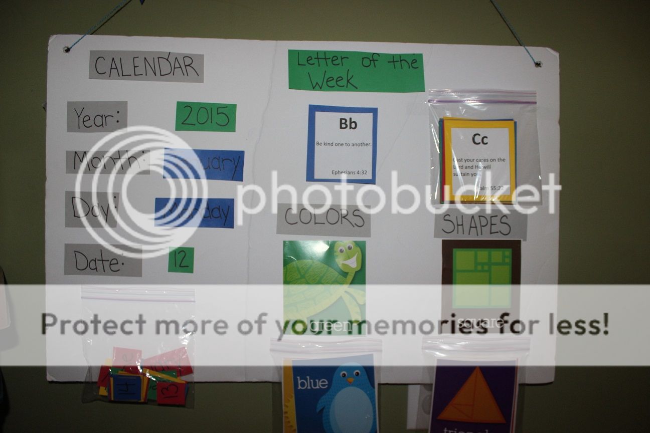 | Our letter B verse was "Be kind one to another. Ephesians 4:32." We also worked on reviewing the color green and the square shape. |