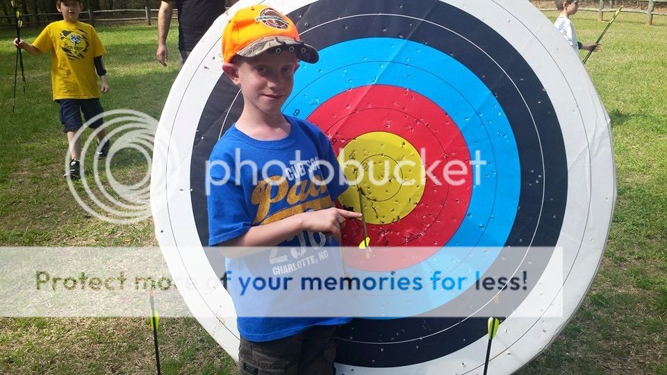 | Evan's archery skills have improved, and he was the only kid to score a bulls eye at the Spring camping trip. |